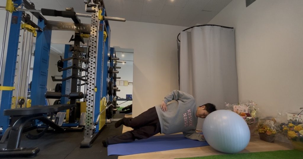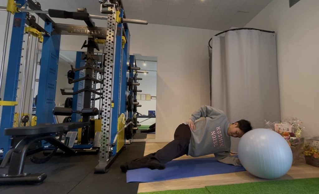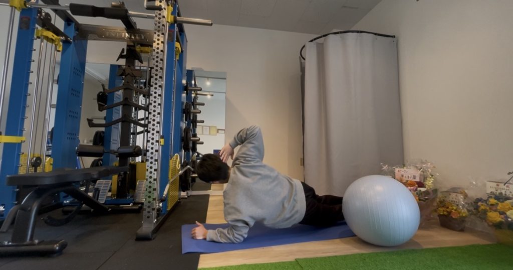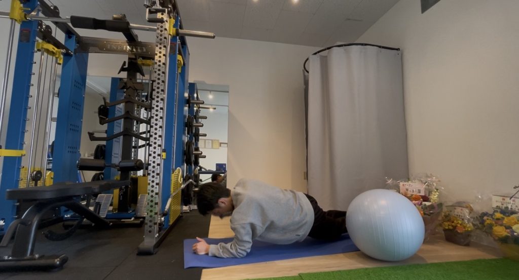 🔹バランスボールの重さに負けて軸がぶれないように保つ