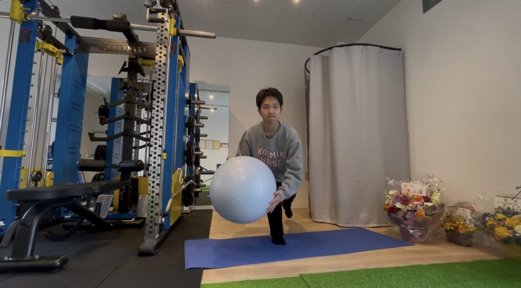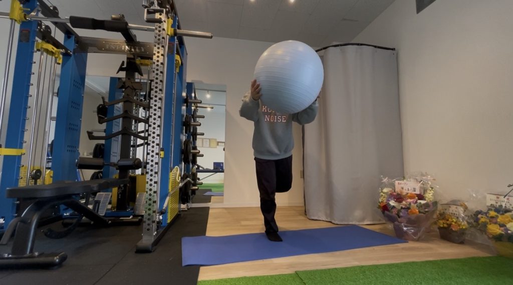 ①片脚立ちになり、バランスボールを持つ