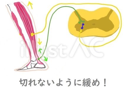 そうなると、腱が伸ばされてきます。その結果ゴルジ腱器官を刺激して脊髄の運動神経(筋肉を動かす)を抑制し、筋肉の緊張を解いていきます。(1B抑制)=筋肉が柔らかくなる。。。ということです。